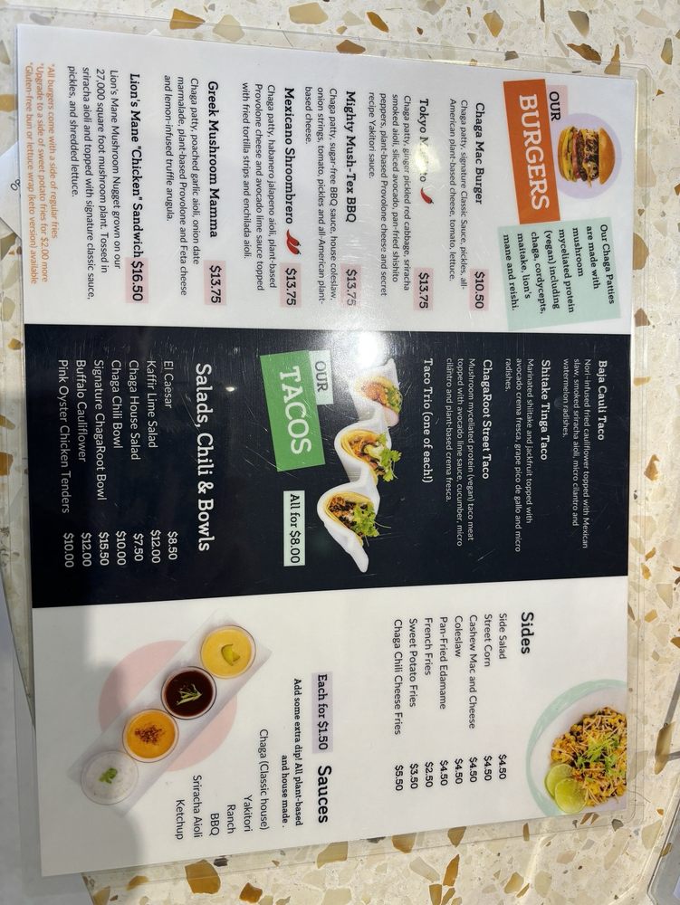 Beyond mere taste, ChagaRoot prides itself on sustainability, utilizing compostable containers and offering bike parking—making it an eco-conscious choice for burger lovers. Plus, with features like free Wi-Fi and waiter service, your experience is sure to be comfortable and convenient.